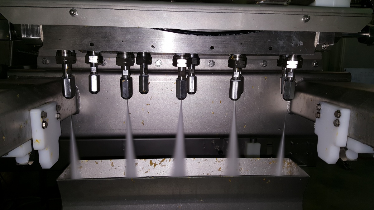 Une fois épluchés, les agrumes sont chargés sur des plateaux. Ils sont ensuite convoyés vers la zone de découpe au jet d’eau pure équipée de 20 têtes (10 horizontales et 10 verticales). Un robot 6 axes permet de faire pivoter le plateau chargé et de réaliser des découpes de cubes ou de tranches. L’étape suivante du traitement des agrumes est le déchargement des morceaux sur un dernier convoyeur. Enfin, les fruits sont triés et emballés.