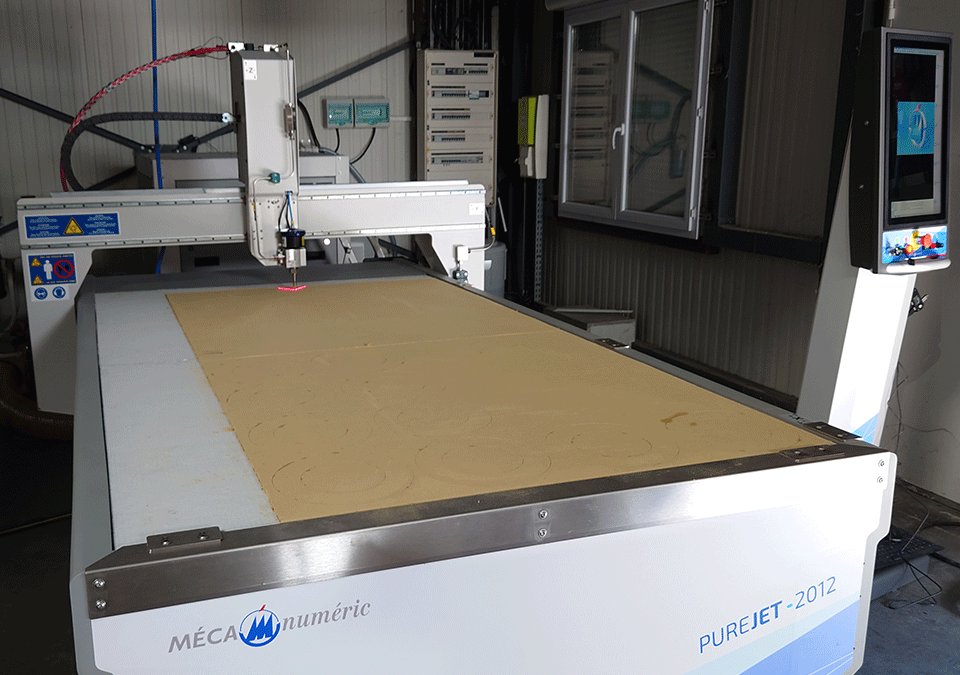 Les travaux qu’on réalise sur la machine jet d’eau PUREJET 2012 sont des travaux de découpes de produits souples de type feutres, papiers, textiles sur lesquels nous opérons des découpes de pièces de petites dimensions à partir de quelques mm jusqu’à plusieurs centaines de mm pour les plus grosses pièces. Sur la partie mécanique avec la MECAPRO NL 4121 nous utilisons la machine sur 2 opérations principales : l’usinage en 3 axes, 2D et 3D pour la réalisation de tout un tas de pièces que ce soit des joints, que ce soit des éléments mécaniques toujours dans nos matériaux, c'est à dire que nous ne travaillons pas le métal mais au contraire des matériaux réfractaires, des produits denses, poudreux, friables, sur lesquels nous avons trouvé un très bon compromis d’usinage et également le cutter qui nous sert à découper d’autres produits souples qui ne passent pas sur la jet d’eau pour des questions dimensionnelles.