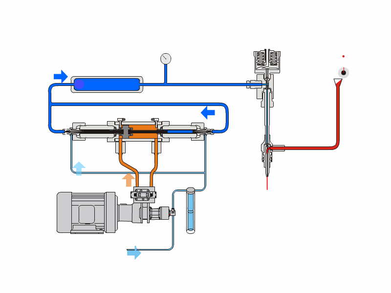Les pompes à entraînement direct sont généralement constituées de 3 cylindres entrainés par un moteur électrique. Lors du fonctionnement de la pompe, les cylindres doivent être refroidis, le plus souvent via une circulation d’eau en circuit ouvert qui consomme de l’eau en continu (en plus de l’eau qui est consommée pour réaliser les découpes).